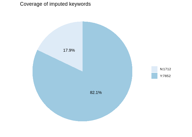 Approximately 82.1% of the papers have keyword coverage after imputation. Also, we can find that all the imputed keywords are within cleaned keywords.